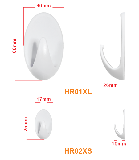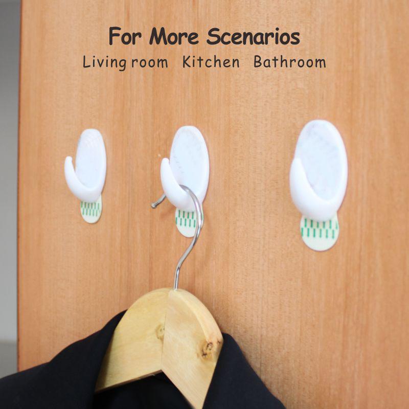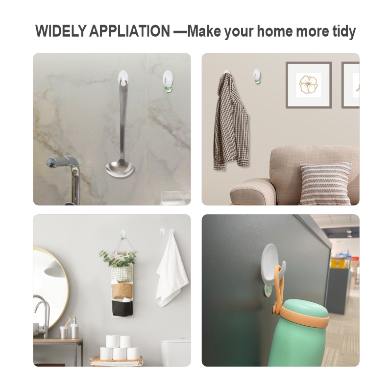 Крючки имеют гладкий, прочный корпус из белого пластика в сочетании с высокоэффективной съемной клейкой подушечкой. Они надежно удерживают легкие предметы повседневного обихода (полотенца, аксессуары и т. д.) на гладких поверхностях (плитка, стекло, дерево) без сверления; клейкая основа легко снимается, не оставляя следов.