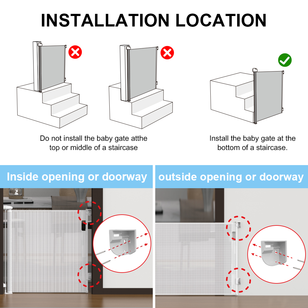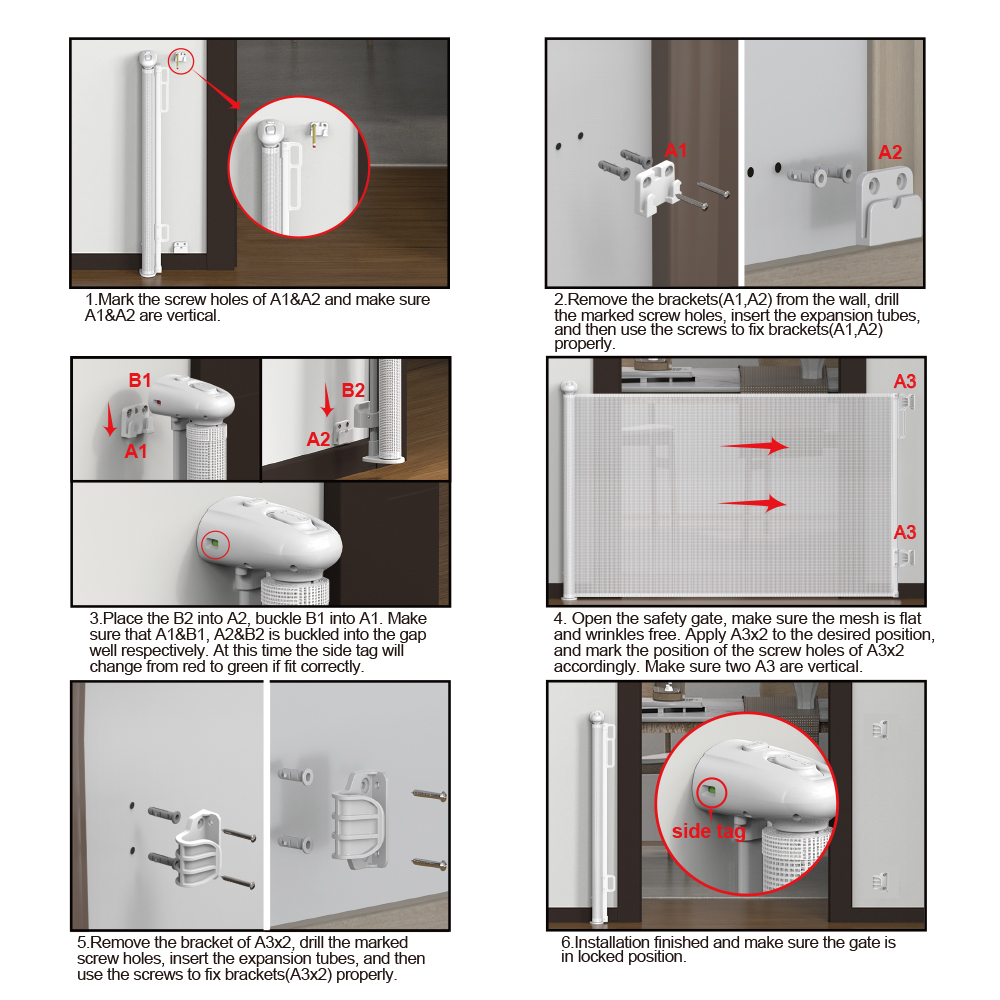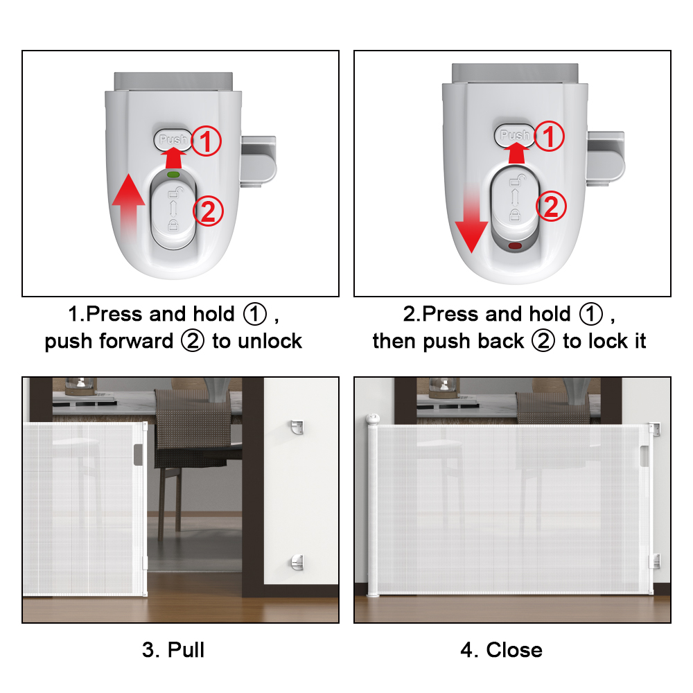 Раздвижные ворота с креплением на фурнитуру можно установить как внутри проёма, так и снаружи. После установки переместите защитную сетку из ПВХ на другую сторону проёма и зацепите её за крепёжную фурнитуру. Зафиксируйте ворота с помощью легко поворачивающегося колпачка. Индикаторное окошко позволяет легко увидеть, закрыты ли ворота или открыты.
