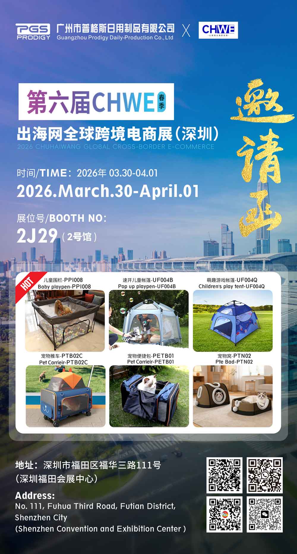 We are Guangzhou Prodigy Daily-Production Co., Ltd. (PGS), a professional manufacturer specializing in pet products and children’s proof products. At the exhibition, we will showcase our best-selling products, including: Baby playpen (PP1008) Pop up playpen (UF004B) Children’s play tent (UF004Q) Pet carrier (PTB02C, PETB01) Pet bed (PTN02)
