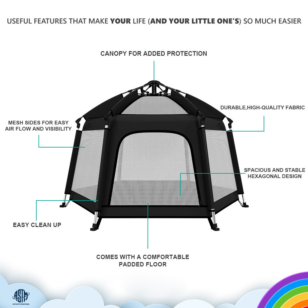 - 【Навес с защитой от УФ-излучения UPF50+, безупречная проработка деталей】Этот игровой манеж для использования как в помещении, так и на открытом воздухе оснащен навесом с защитой от УФ-излучения UPF50+, который защитит детей от ультрафиолета на улице. Дышащая сетка, двойные двери, верхние вентиляционные отверстия обеспечивают комфорт и воздухопроницаемость, а также позволяют вам следить за вашим маленьким исследователем.